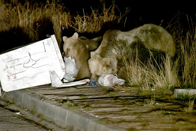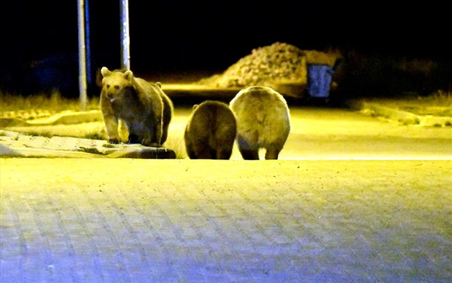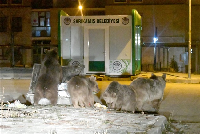 Yaklaşık 5 ay önce 3 yavrusuyla TOKİ bölgesine gelen ve boynunda verici tasması bulunan anne bozayı, bu süre zarfında yavrularını çöp konteynerlerindeki yiyeceklerle büyüttü.