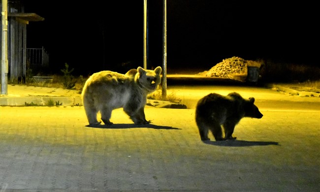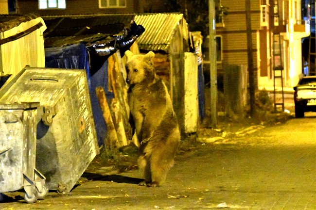 Karanlık çöktüğünde ormanlık alana yakın İnönü Mahallesi ve TOKİ bölgesine inen ayılar, çöp konteynerlerinde karınlarını doyurup tekrar yuvalarına dönüyor.