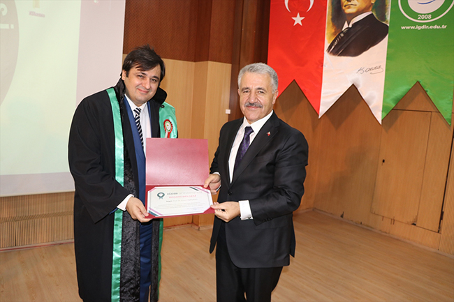 65. dönem Ulaştırma, Denizcilik ve Haberleşme Bakanı Kars Milletvekili Ahmet Arslan ile Tarım, Orman ve Köyişleri Komisyonu Başkanı Kars Milletvekili Prof. Dr. Yunus Kılıç, profesörlük ve doçentlik ünvanı alan akademisyenlere belgelerini verdi.