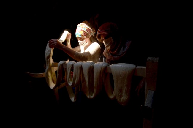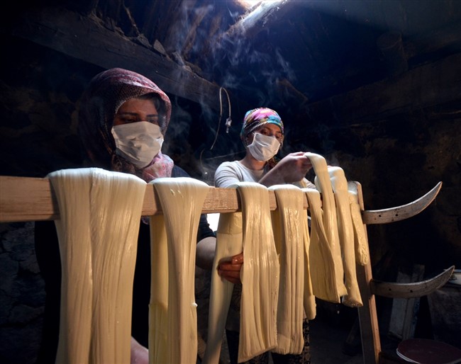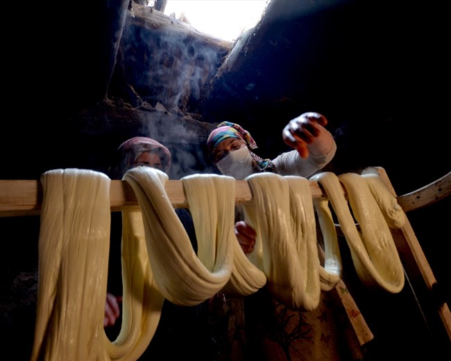 Yakılan tandır ve ocaklardaki kazanlara doldurulan süt burada yarım saat kaynatıldıktan sonra, kadınlar tarafından tel tel olana kadar zorlu yoğurma işleminden geçiriliyor.