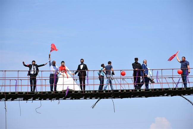 Düğün öncesi, yaklaşık 35 yıl önce yapılan 110 metre uzunluğundaki asma köprüyü balonlar ve Türk bayrakları ile süsleyen çiftin yakınları, gelinlik ve damatlık giyerek köprüye gelen Gelekçi çifti ile oyunlar oynayıp gönüllerince eğlendi.