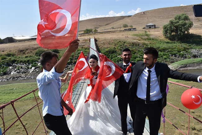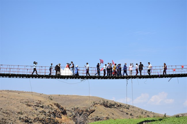 Kars'ın Akyaka ilçesinde dünyaevine giren çiftin düğünü 110 metrelik asma köprü üzerinde yapıldı.