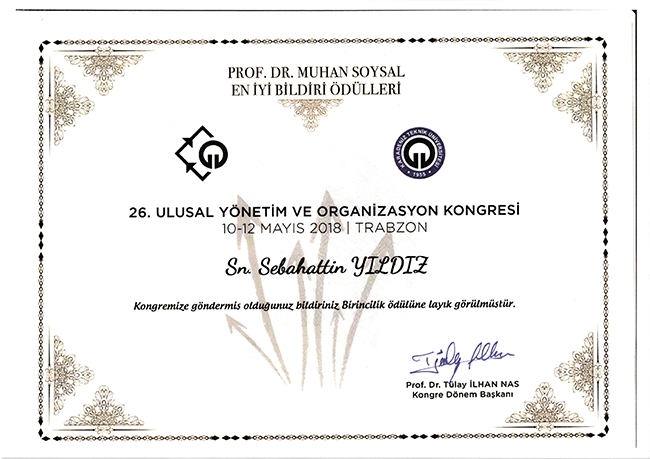 Trabzon’da düzenlenen, 90 farklı üniversiteden 279 bilim insanının katıldığı ve 125 bildirinin sunulduğu 26. Ulusal Yönetim ve Organizasyon Kongresi’nde En İyi Bildiri Ödülleri yarışmasında birincilik ödülüne Kafkas Üniversitesi İktisadi ve İdari Bilimler Fakültesi Yönetim ve Organizasyon Anabilim Dalı Başkanı Doç. Dr. Sebahattin Yıldız layık görüldü.