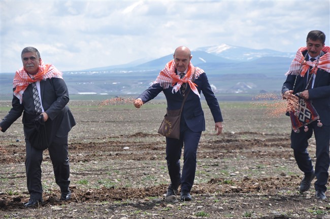 Başkan Soyer ve beraberindekiler daha sonra “kurda, kuşa, aşa” diyerek arpa buğdayını elleriyle tarlaya ektiler.