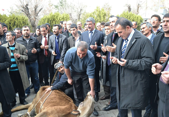 Buradan kalabalıkla birlikte Kağızman Belediyesi önüne gelen Nevzat Yıldız için kurban kesildi ve ardından dualar okundu. MHP Genel Başkan Yardımcısı ve İstanbul Milletvekili Atilla Kaya kesilen kurbanın kanından, Kağızman Belediye Başkanı Nevzat Yıldız’ın anlına sürdü.