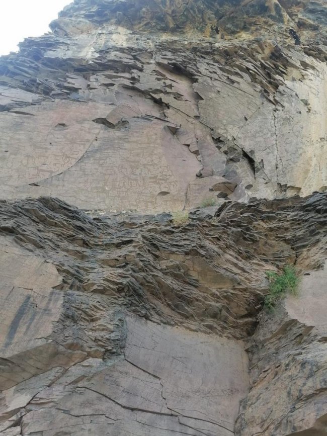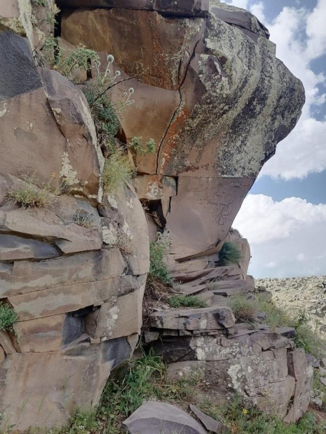 Kağızman Kaymakamı Hamza Türkmen, Camuşlu köyünde bulunan Üst Paleolitik Döneme Ait, Üzerinde İnsan ve Hayvan Figürleri barındıran yazılı kaya resimlerini yerinde inceledi.