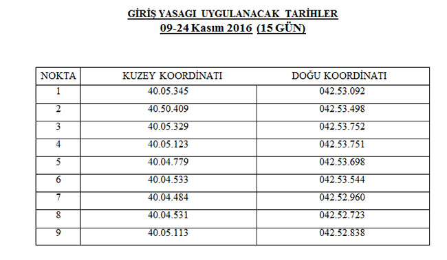 Kars ili Kağızman ilçesi sınırları dahilinde bulunan ve aşağıda koordinatları belirtilen bölge, 09-24 Kasım 2016 tarihleri arasında (15 gün süreyle) özel güvenlik bölgesi ilan edildi.