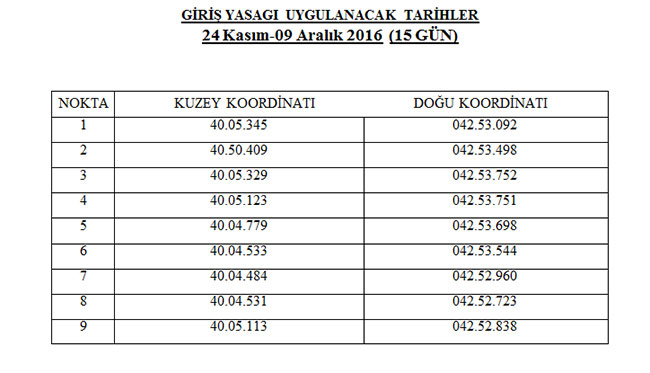 Kars ili Kağızman ilçesi sınırları dahilinde bulunan ve aşağıda koordinatları belirtilen bölge, 24 Kasım-09 Aralık 2016 tarihleri arasında (15 gün süreyle) özel güvenlik bölgesi ilan edildi.