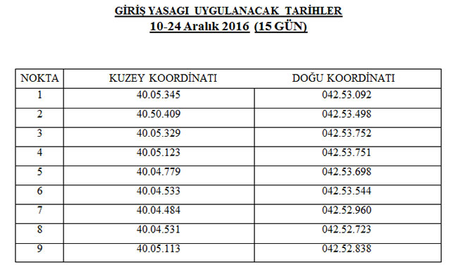 Kars ili Kağızman ilçesi sınırları dahilinde bulunan ve aşağıda koordinatları belirtilen bölge, 10-24 Aralık 2016 tarihleri arasında (15 gün süreyle) özel güvenlik bölgesi ilan edildi.