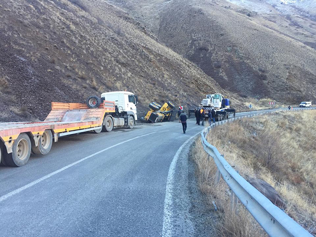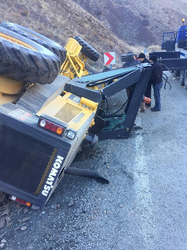 Kağızman-Karakurt karayolunda iş makinesi kaza yaptı.