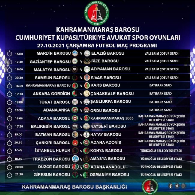 Türkiye Barolar Birliği ile Kahramanmaraş Baro Başkanlığı’nın işbirliğinde ve öncülüğünde Kahramanmaraş’ta Türkiye Avukat Spor Oyunları/Cumhuriyet Kupası” müsabakasında Kars Barosu Kahramanmaraş Barosunu 5-0 yendi.