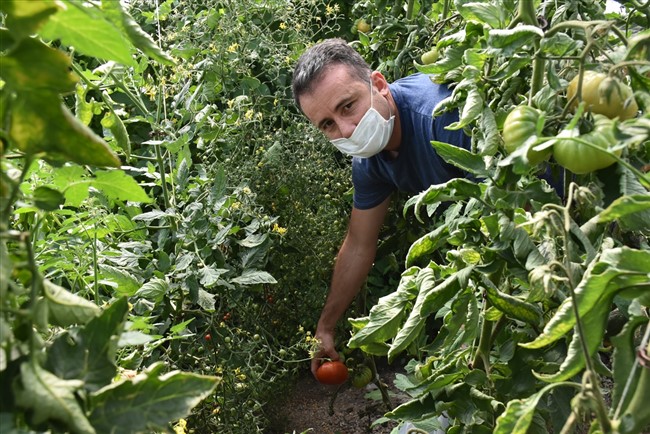 Domates, biber, fasulye, çilek gibi sebze ve meyvelerin tarladan sofraya ulaşmasına tanıklık eden öğrenciler, yeni tip koronavirüs tedbirleri kapsamında maske takıp sosyal mesafe kuralına uyarak gruplar halinde serada vakit geçiriyor.