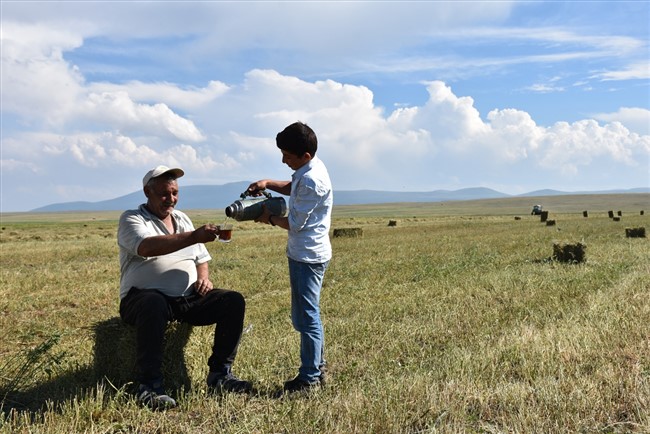 Tarlaya gelip ailesine yardım eden çocuklar ise ot balyaları arasında renkli görüntüler oluşturuyor. Çalışanlara çay ve su ikramında bulunan çocuklar zaman zaman da yardım etmeyi ihmal etmiyor.