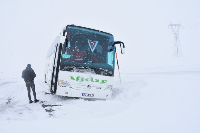 Trabzon – Iğdır seferini yapan yolcu otobüsü şiddetli kar ve tipi nedeniyle Kars’ta kara saplandı.