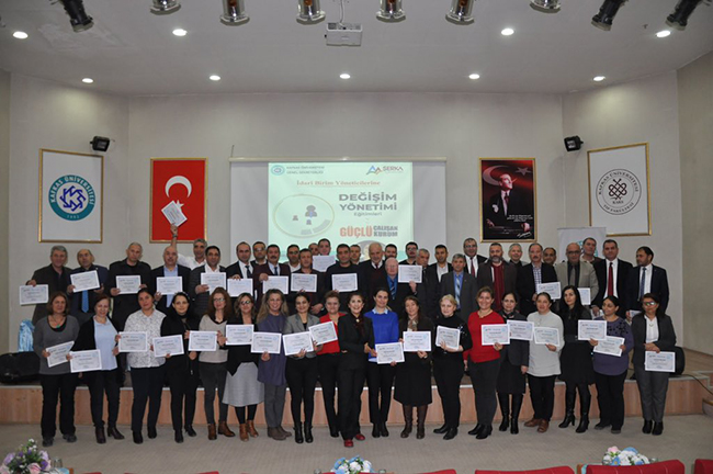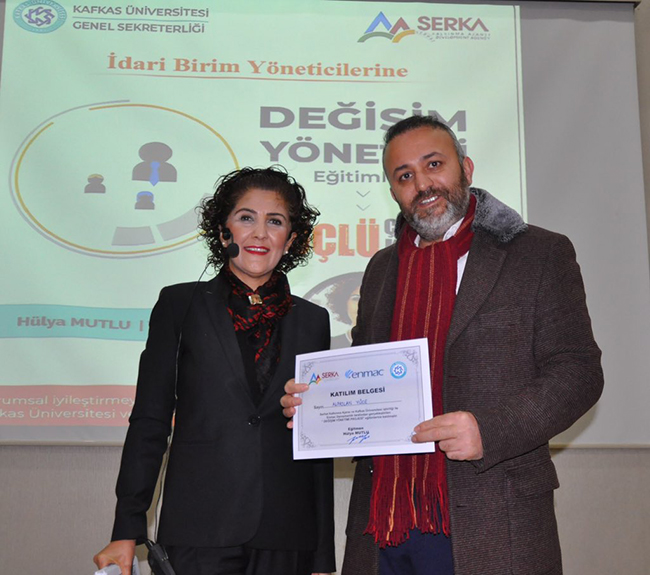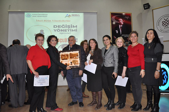 Kafkas Üniversitesi ve Serhat Kalkınma Ajansı Teknik Destek Programı kapsamında, Genel Sekreterliğe bağlı idari birim yöneticilerine yönelik olarak verilen “Güçlü Çalışan, Güçlü Kurum” sloganıyla “Değişim Yönetimi Projesi“ eğitiminin sertifika töreni gerçekleşti.