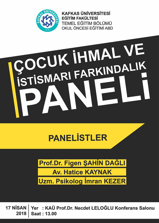 Kafkas Üniversitesi Eğitim Fakültesi Temel Eğitim Bölümü Okul Öncesi Eğitimi Anabilim Dalı tarafından Çocuk İhmal ve İstismarı Farkındalık” paneli düzenlenecek.