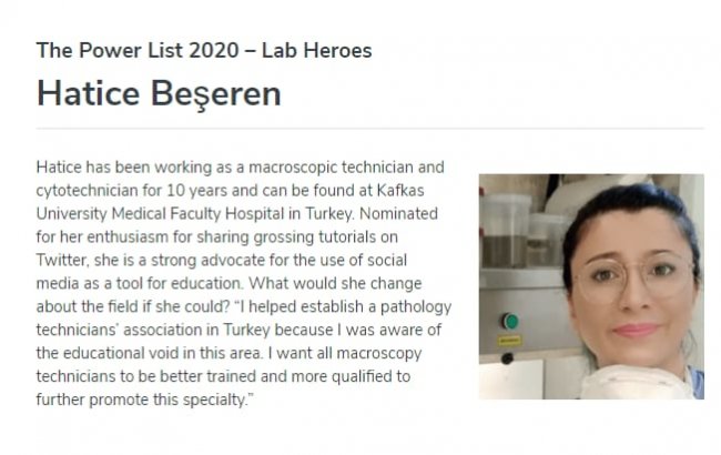Kafkas Üniversitesi (KAÜ) Eğitim Araştırma ve Uygulama Hastanesi Patoloji Laboratuvarında görevli Uzman Biyolog Hatice Beşeren, The Pathologist dergisinin yayımladığı Dünya Patolojisinde “Laboratuar Kahramanları/Lab Heroes” kategorisinde 2020 yılında (The Pathologist’s Power List 2020) seçilen tek Türk bilim insanı oldu.