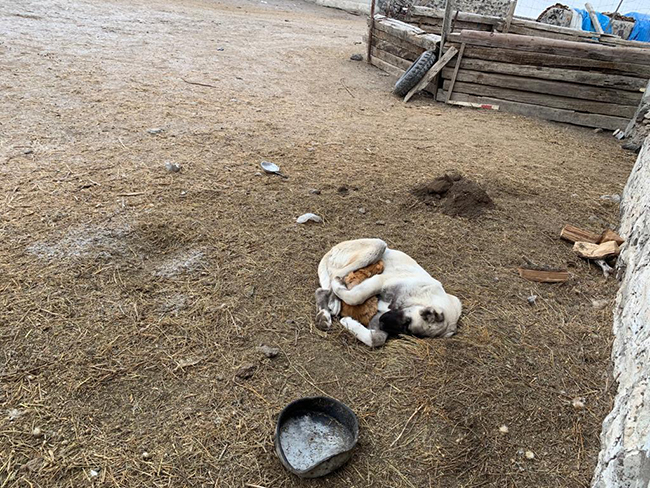 Kars'ın Akyaka ilçesinde kedi ve köpeğin soğuk havada birbirine sarılıp uyuması renkli görüntü oluşturdu.