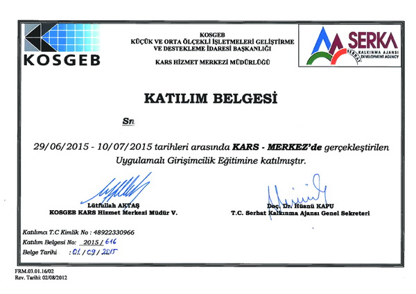 SERKA, KOSGEB işbirliğiyle 2011 yılından bugüne kadar faaliyet yürüttüğü dört ilde toplam 81 Girişimcilik Eğitimi düzenledi. Girişimcilik kültürünü yaygınlaştırmak ve girişimcilerin kuracakları işletmelerin başarı düzeylerini arttırmak amacıyla düzenlenen eğitimlere başvuran toplam 2 bin 369 katılımcıdan 2 bin 143’ü eğitimini tamamlayarak KOSGEB’den girişimcilik sertifikası almaya hak kazandı. Eğitimlerin başladığı tarihten bugüne kadar en fazla eğitim Ağrı’da düzenlendi. Ağrı’da düzenlenen 33 eğitime başvuran 978 kişiden 917’si sertifika aldı. En az eğitim ise, Iğdır’da gerçekleştirildi. Buna göre, düzenlenen 4 eğitimde başvuran 120 kişiden 111’i girişimcilik sertifikası aldı. Kars’ta düzenlenen 28 eğitimde başvuruda bulunan 792 kişiden 678’i belge almaya hak kazandı. Ardahan’da ise, 16 düzenlendi. Başvuruda bulunan 479 kişiden 437’si girişimcilik sertifikası aldı.