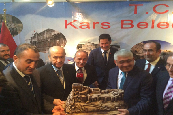 Kars Belediye Başkanı Murtaza Karaçanta ile birlikte stantları gezen Devlet Bahçeli’ye Karaçanta, Kars Kalesi minyatürünü hediye etti.